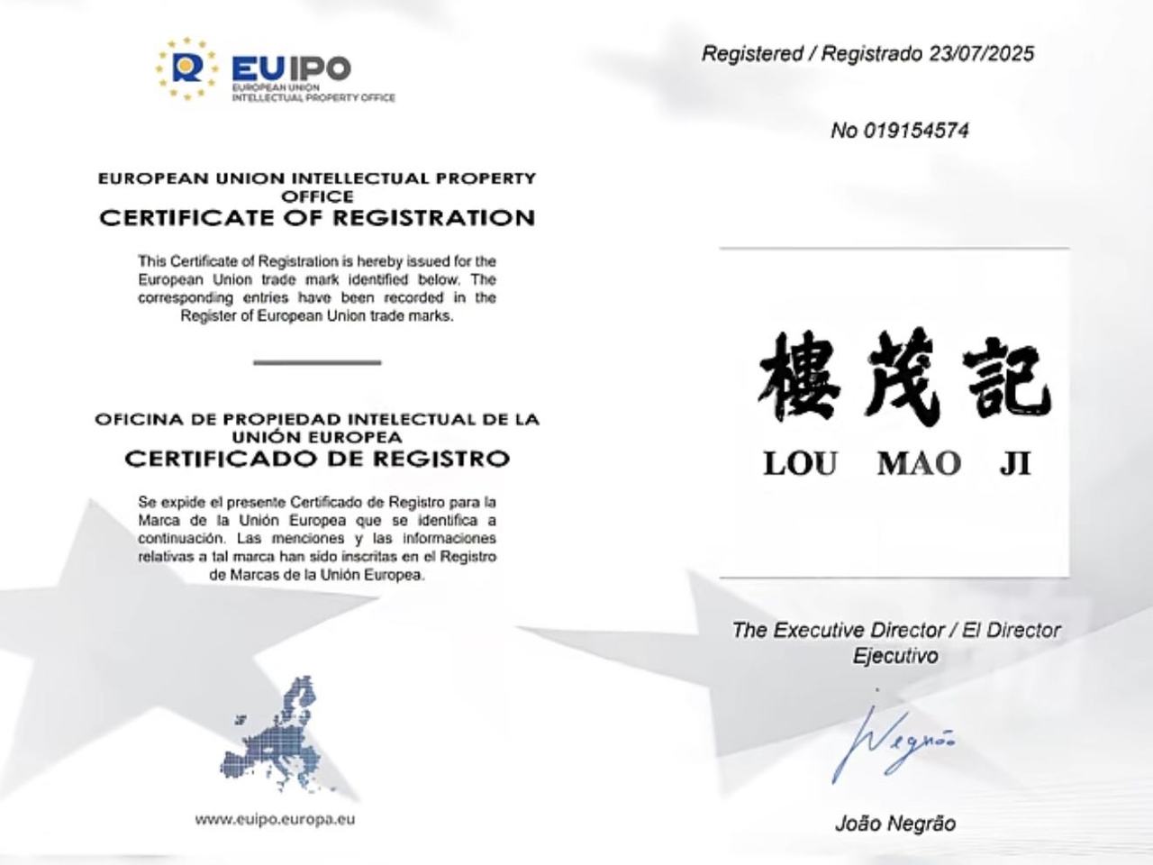 据悉,“楼茂记”于去年12月正式申请欧盟商标,目前已成功注册29、30、31、32、33、35、43类欧盟商标,其产品将进一步推广至欧盟市场。